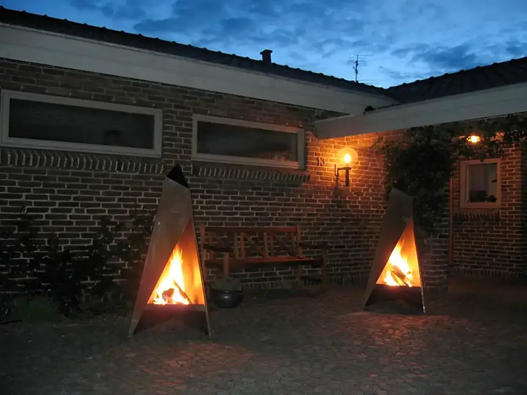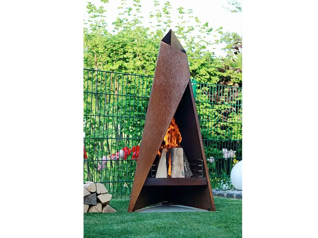 Heta Tipi gives off a comfortable heat on cool summer evenings, it is practical and easy to use, easy to clean and not at least environmentally friendly. Made of Corten, which is particularly suitable for outdoor fireplaces. The surface forms an even layer of patina over extended periods of time, which never corrodes because of the surface constancy.